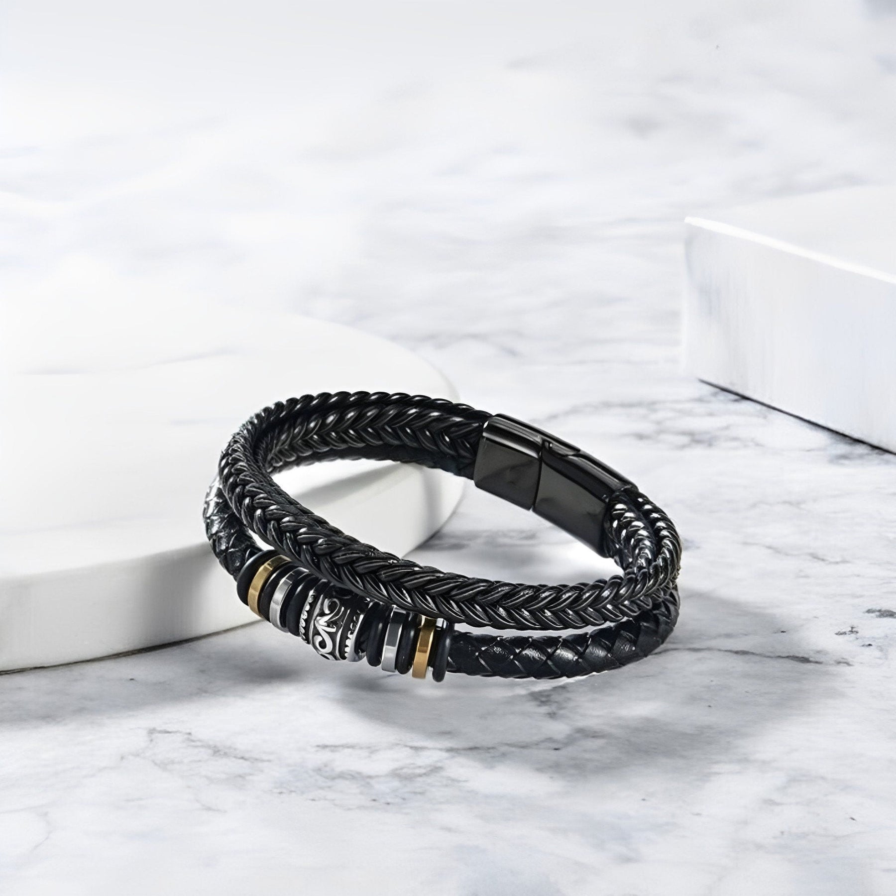 ✔ Fear of Quality & Longevity / Assurance of Enduring Value You demand a gift as enduring as your love; the woven black leather and surgical-grade stainless steel beads document the durability and longevity, physically embodying the promise of unfading love that will last as long as his journey requires it.