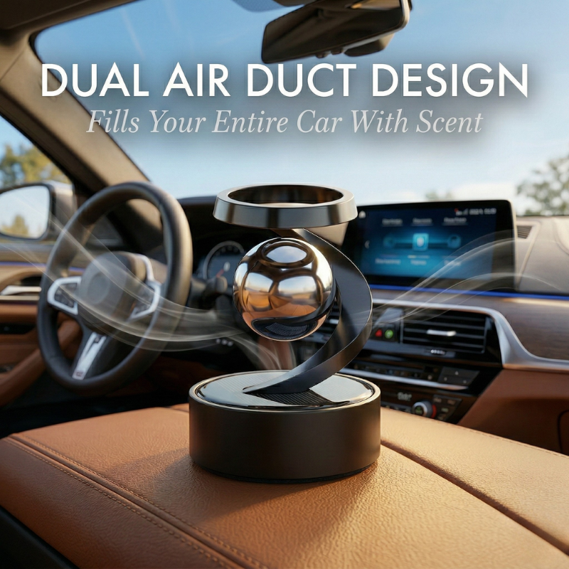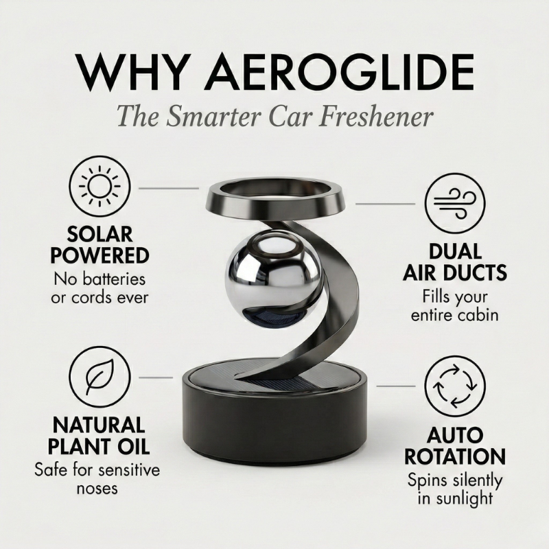 Introducing Aeroglide™: the solar-powered aromatherapy diffuser with a levitating, rotating sphere that transforms your dashboard into something people actually stop and stare at.
