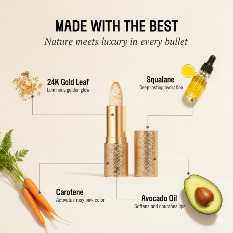 ✔ LUXURY YOU CAN SEE — 24K GOLD IN EVERY SWIPE - Those shimmering flecks suspended in the clear bullet? That's real 24-karat gold leaf. It catches the light on your lips for a subtle, luminous glow that elevates any look — from no-makeup mornings to date night glamour.