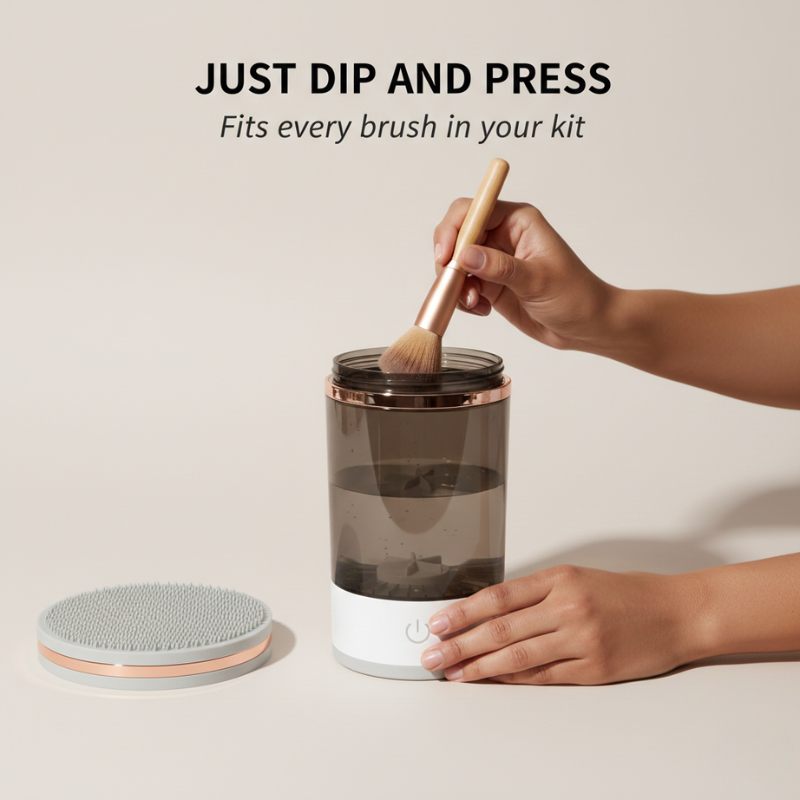 That's not a willpower problem — it's a tool problem. Until now, cleaning makeup brushes meant hunching over a sink with soap and your bare hands, scrubbing bristle by bristle until your fingers pruned.