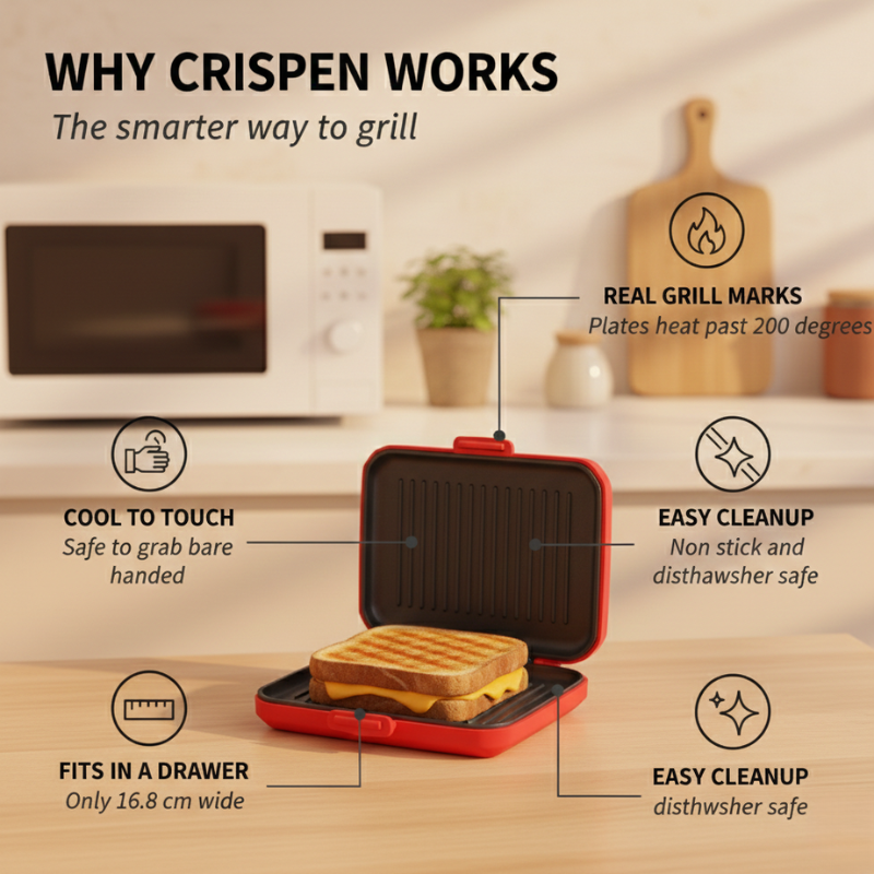 No stovetop. No panini press. No cord. Just your microwave, the Crispwell™, and two to three minutes between you and a hot, melty, perfectly crispy sandwich.