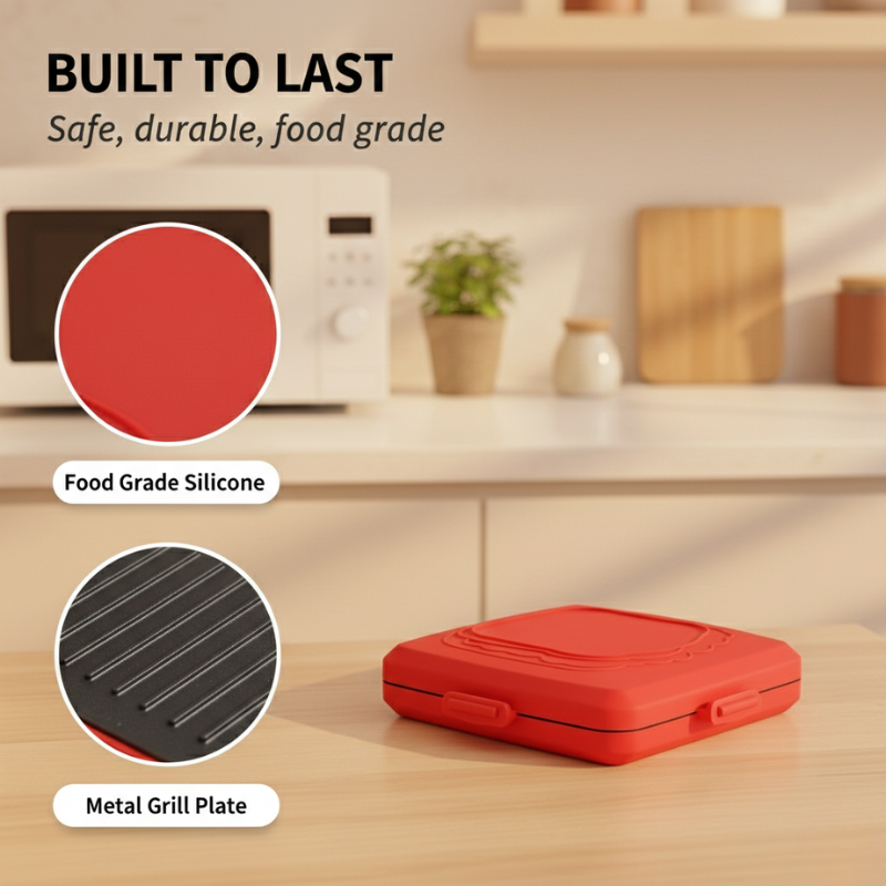 Is it really safe to put metal in the microwave? Yes — the Crispwell™ is specifically engineered for microwave use. The metal grill plates are fully encased in food-grade silicone and designed to absorb microwave energy safely, converting it into direct contact heat. It's been tested and approved for standard household microwaves.