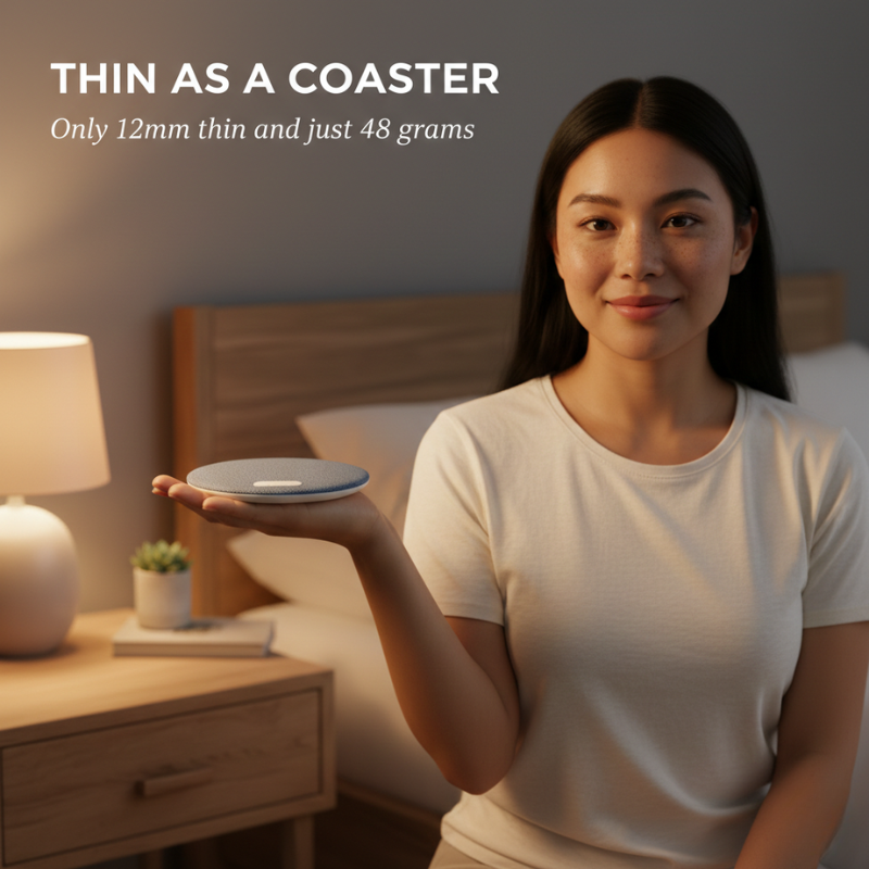At just 12mm thin and wrapped in soft fabric, you won't even feel it's there. Set the auto shut-off timer, press play, and let your pillow do the rest — night after night, for up to 7 days on a single charge.