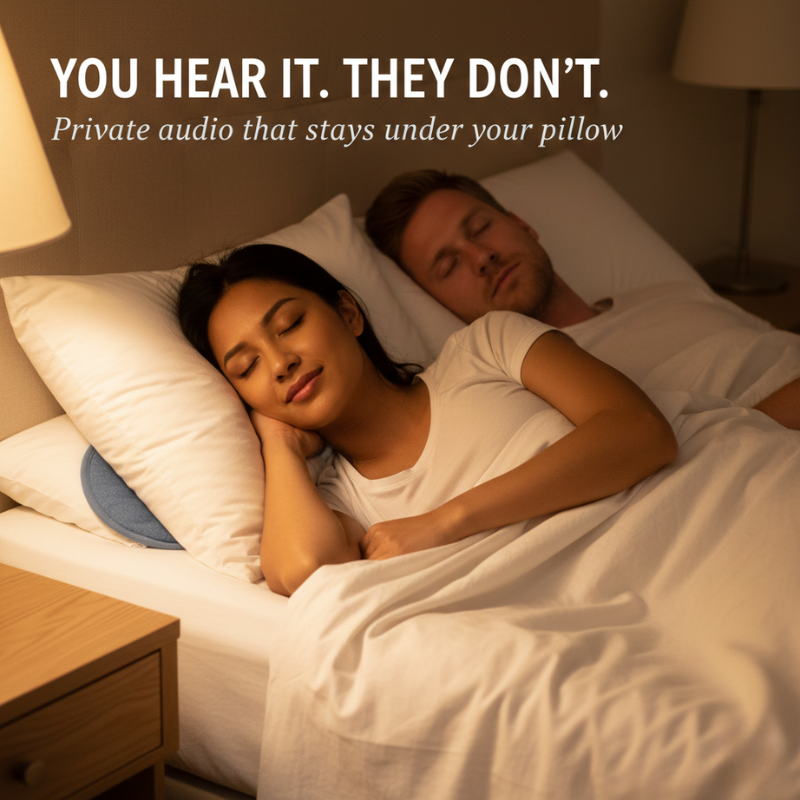 Driftone™ is different. It's a whisper-thin disc that slips under your pillow and turns it into your own private speaker — so only you hear the audio, and your partner hears nothing but silence.