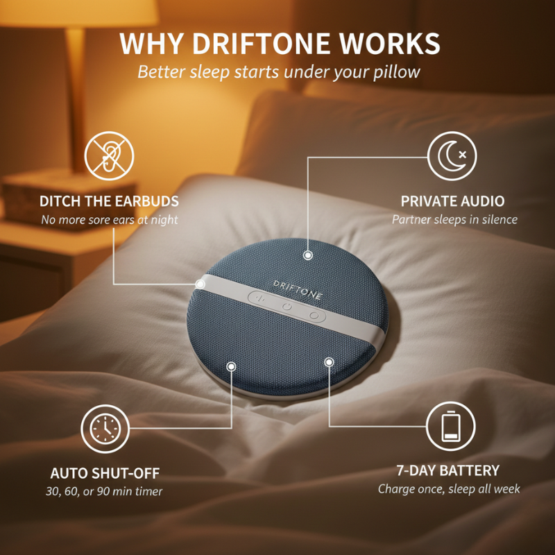 ✔ NO MORE EARBUDS DIGGING INTO YOUR EARS ALL NIGHT - Driftone™ sits invisibly under your pillow — not in your ears. Its ultra-thin 12mm profile means you sleep in any position without feeling a thing, while rich audio reaches only you through the pillow.