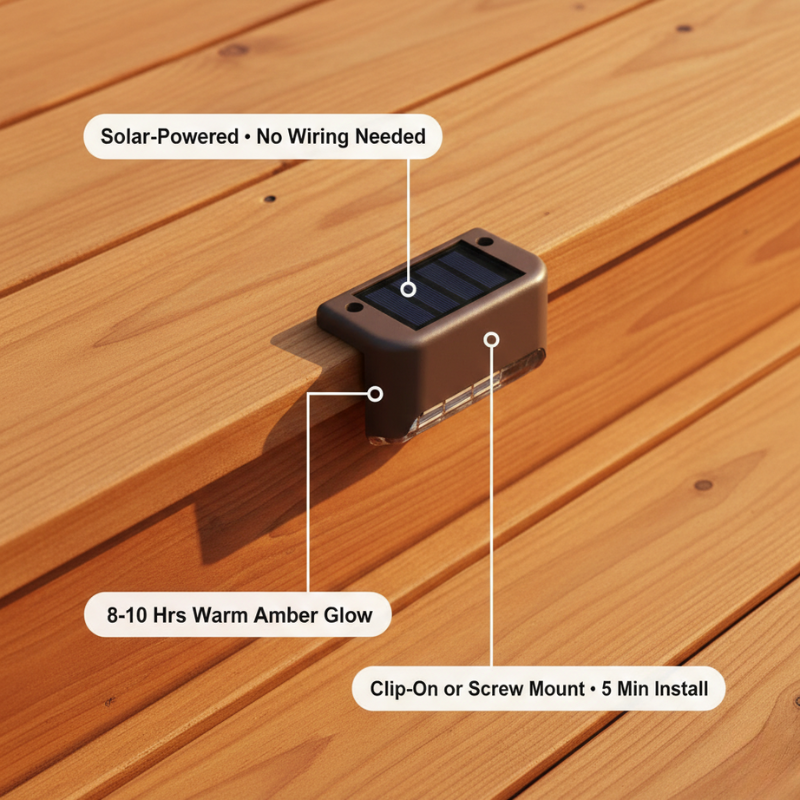 ✔ Clip on or screw in — your choice, either way it's 5 minutes. Two mounting options mean these fit on deck railings, fence tops, porch steps, and stair edges. No drilling required if you don't want it. First-time installers get them up before their coffee gets cold.