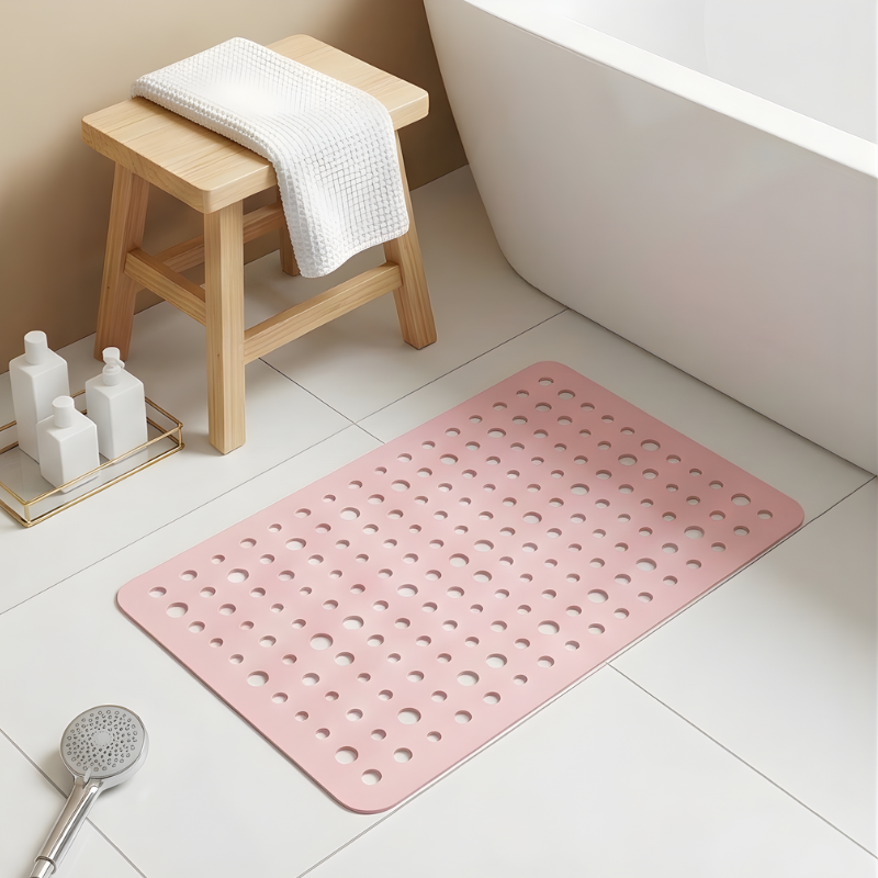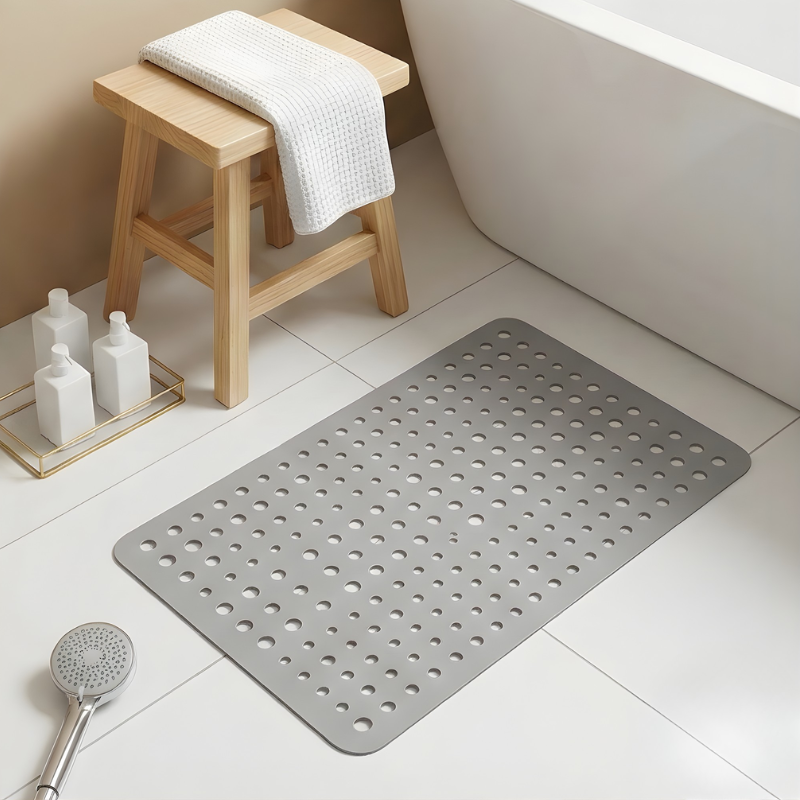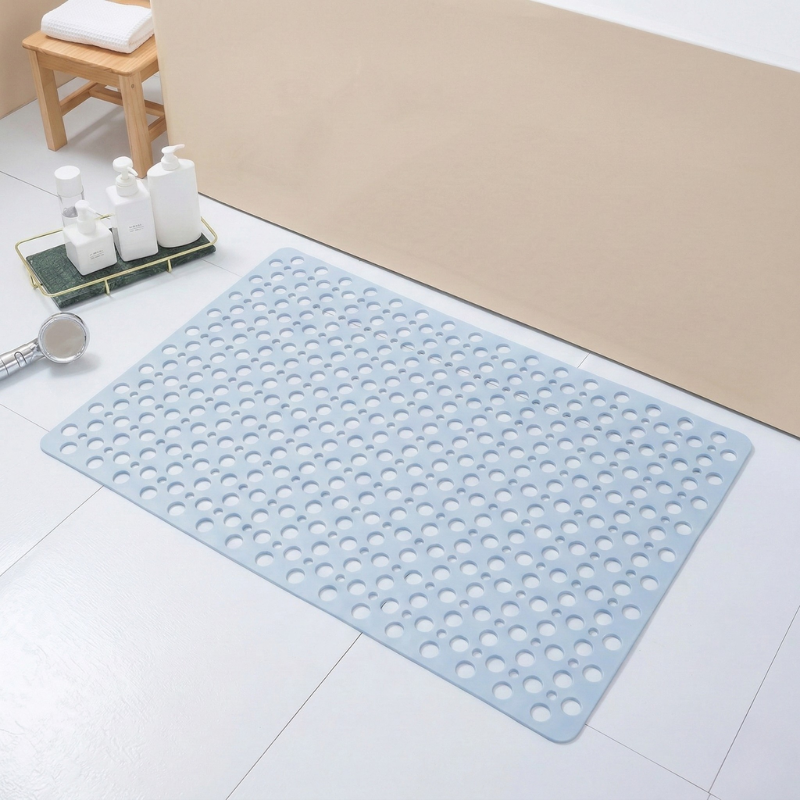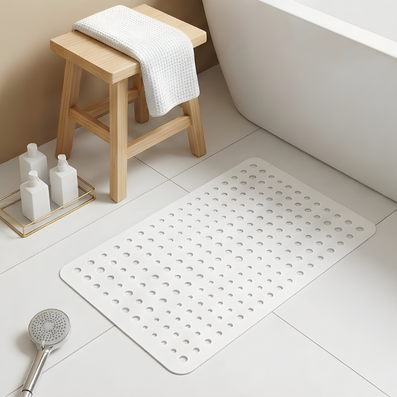 • What are the mat's dimensions and how do I keep it clean?  Gripstead™ measures approximately 24" × 16" (60cm × 40cm) — sized to cover the full standing zone of a standard shower or bathtub floor. To clean, simply lift the mat, rinse both sides under running water, and hang it to air dry. The open-hole PVC design means there is no interior foam to hold moisture or odor.