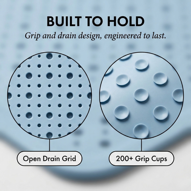 Most shower mats promise to fix it, yet after a week the suction cups give up, the mat drifts toward the drain, and the quiet dread comes back — which is exactly why Gripstead™ was built around a dual-grip suction base with 200+ individual cups and an open drainage-hole grid that lets water escape instantly, keeping the surface dry and the mat locked in place.