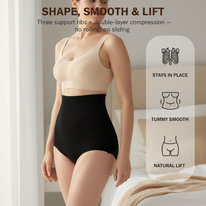 Will this roll down when I sit or bend? No. Unlike most shapewear that relies on compression alone to stay up, this one has three flexible support ribs built into the waistband. They act as an invisible frame that keeps the top edge anchored in place — whether you're sitting at a desk, bending over, or moving through your day. The ribs are thin enough that they won't show through clothing, but firm enough that the waistband stays exactly where you put it.