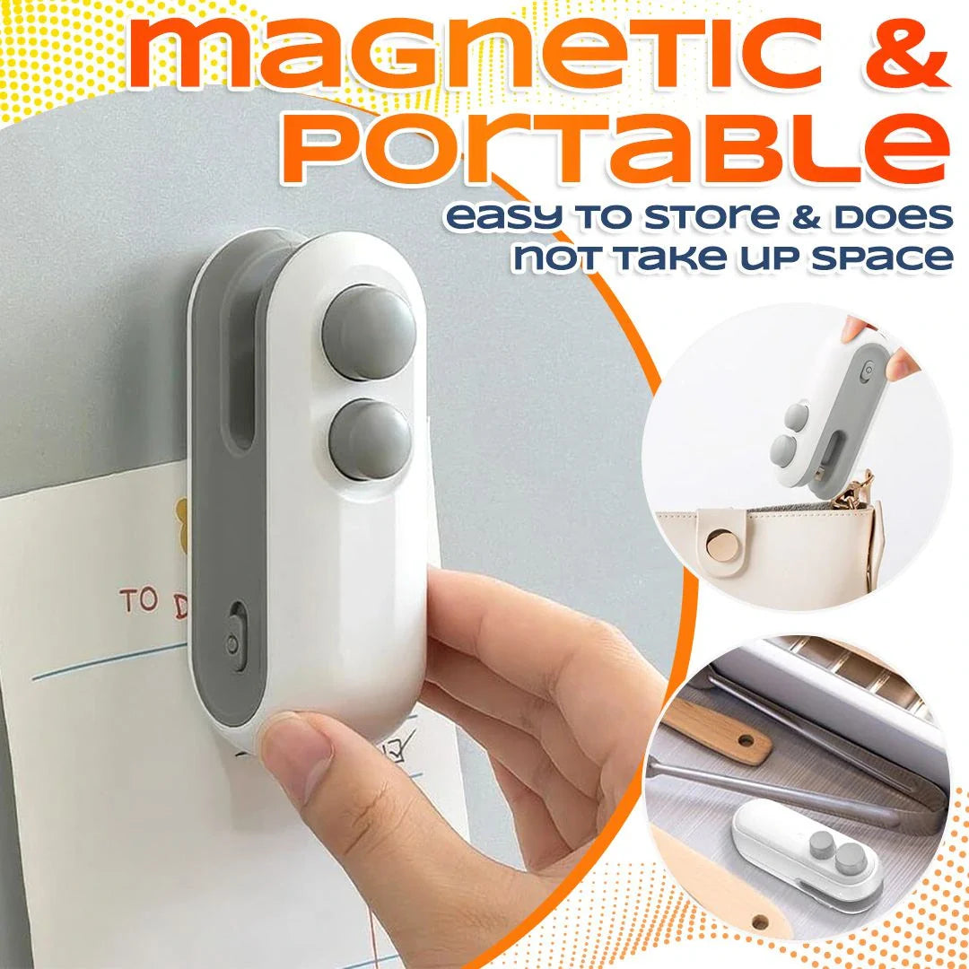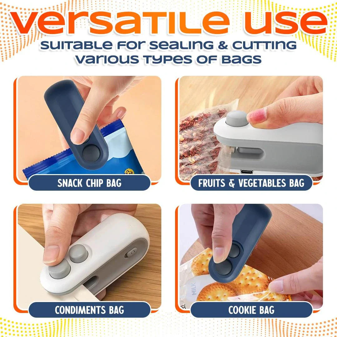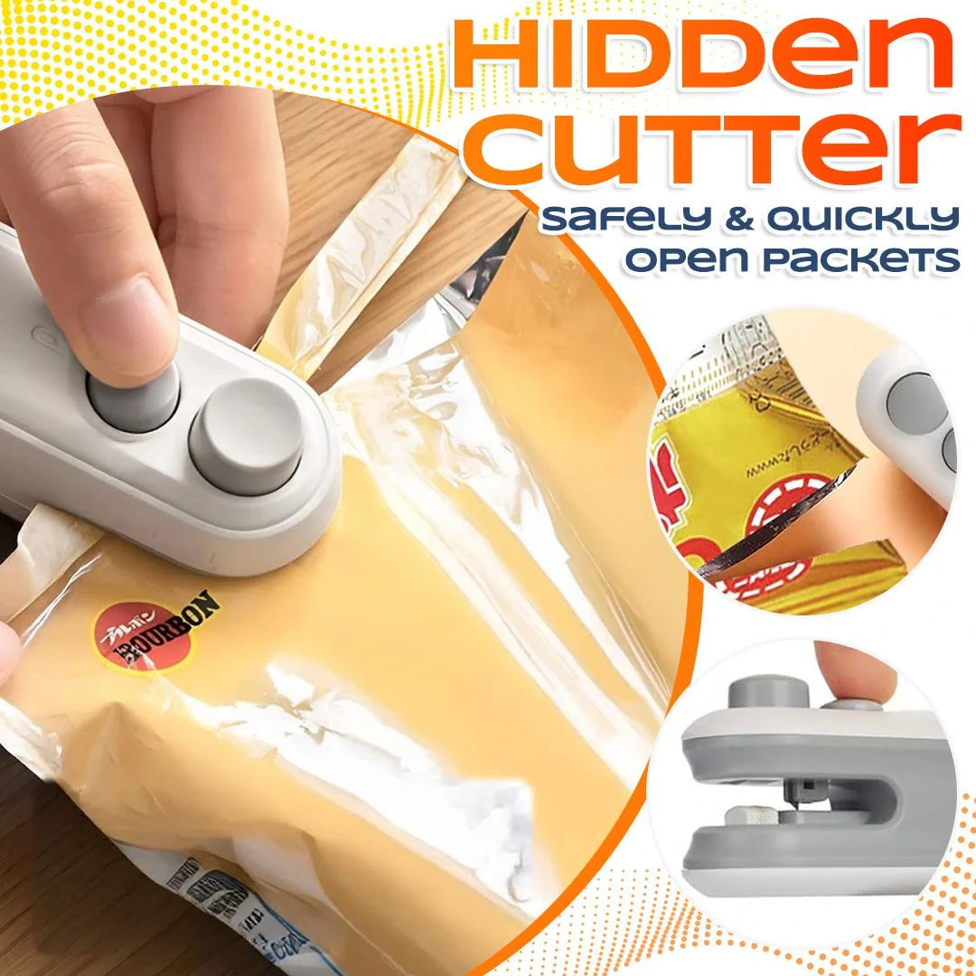 ✔ OPEN & RESEAL WITH ONE TOOL Featuring a Dual-Function Slide Mechanism, the left side houses a precision micro-blade to slice through factory packaging, while the right side instantly heat-seals it back to original freshness.