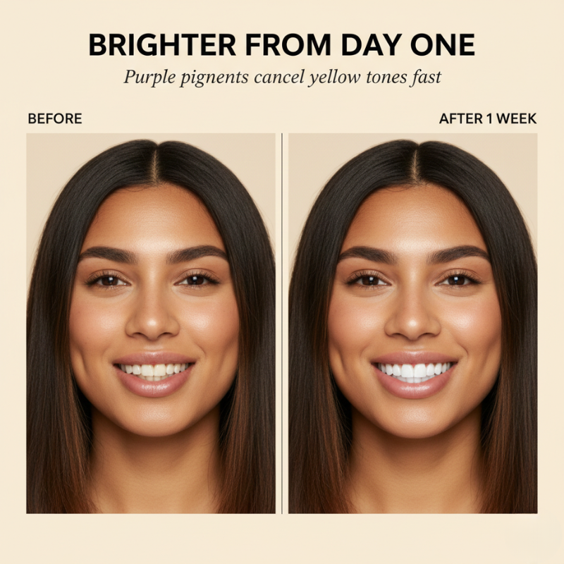 Will the purple powder stain my teeth, toothbrush, or sink? No — the purple pigment is designed to neutralize yellow tones, not deposit color. It rinses away completely, leaving only a brighter appearance behind. Your toothbrush and sink stay clean.