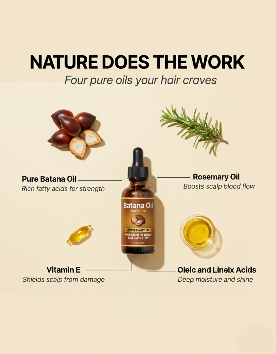 - Key Ingredients: 100% Pure Batana Oil, Rosemary Oil, Vitamin E, Oleic & Linoleic Acids