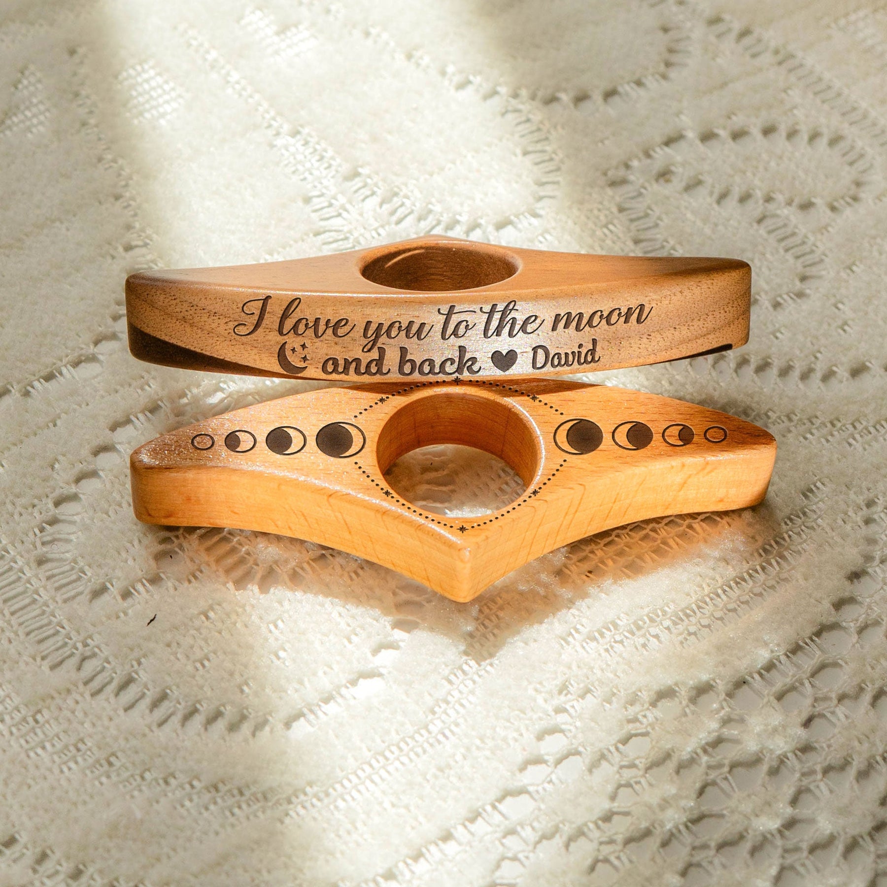 The natural wooden design can be personalized with a meaningful message like "I love you to the moon and back," making it the perfect gift for any book lover.