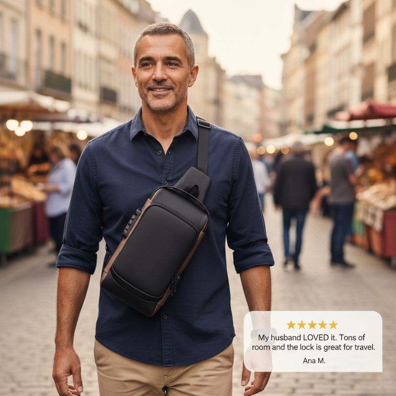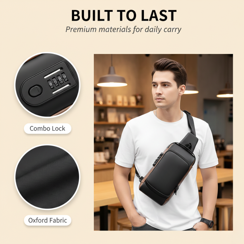 Everything you carry, phone, wallet, keys, earbuds, passport, rides in one compact, waterproof sling that locks shut and charges your devices on the move. The scratch-proof oxford fabric shrugs off rain and rough handling, the built-in USB port keeps your phone alive without stopping, and the padded adjustable strap sits comfortably whether you wear it left or right. This is daily carry, finally solved.