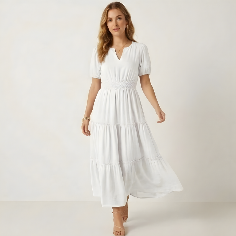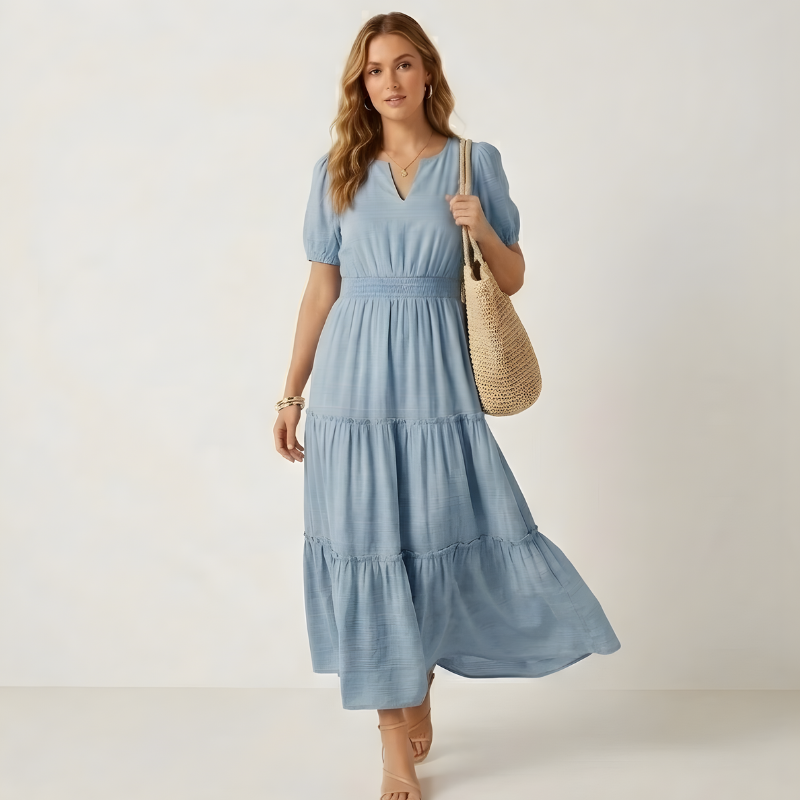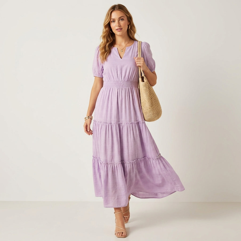 The secret is in the construction: a smocked elastic waist that cinches without squeezing, three flowing tiers that create effortless movement, and a soft textured weave that feels cool against your skin all day — so you stop fidgeting and start enjoying wherever you are.