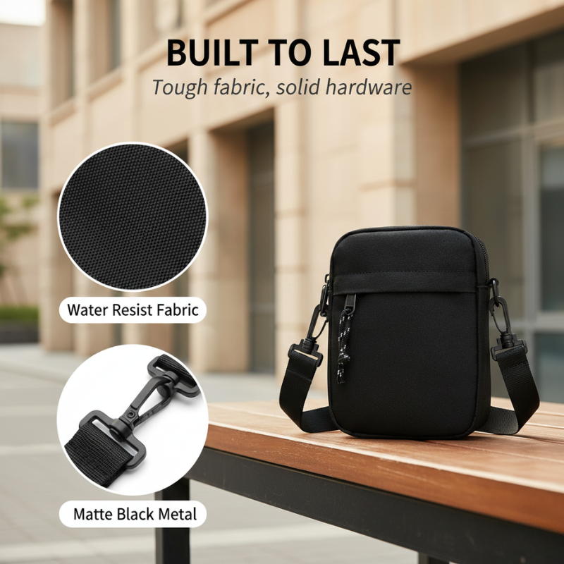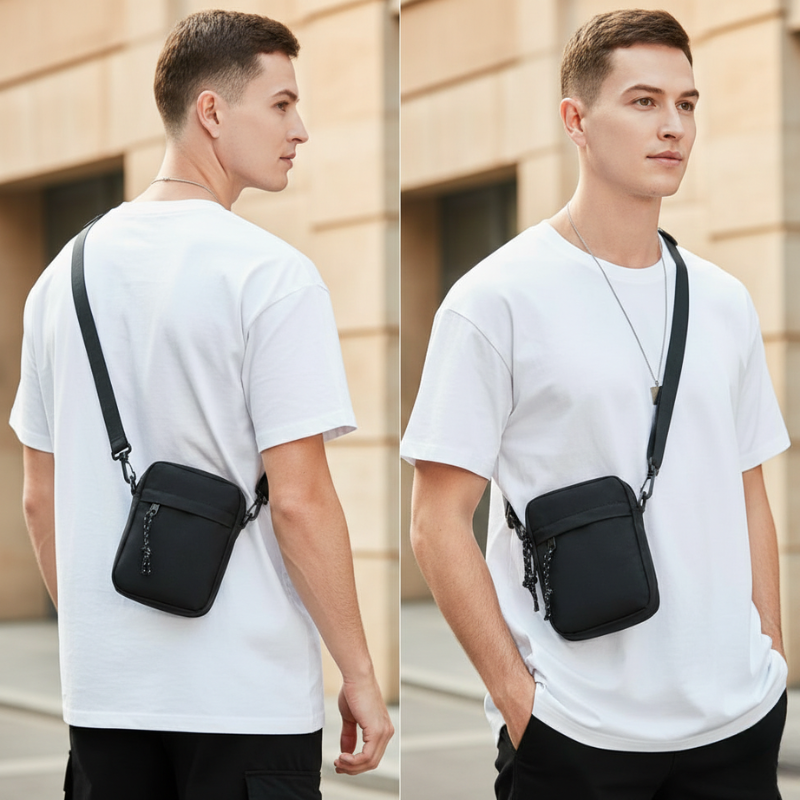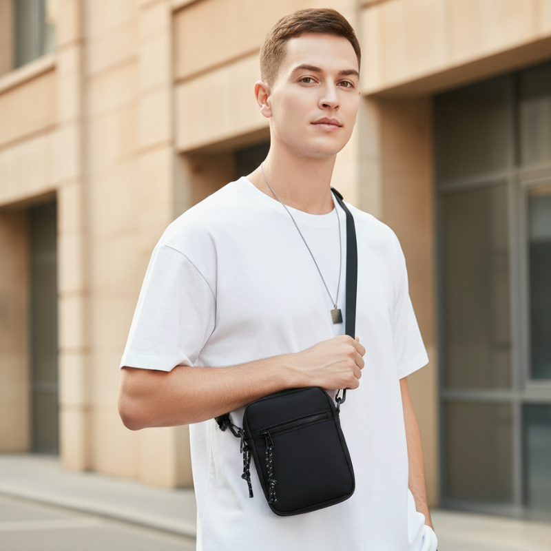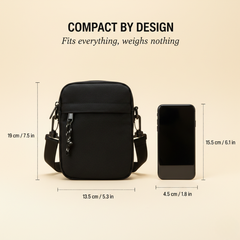 Everything you carry daily — phone, wallet, keys, earbuds — finally has its own dedicated zippered pocket, in a bag barely bigger than your hand. Four separate compartments keep every essential organized and instantly accessible, while the ultra-compact 19cm body sits flush against you — so light and low-profile you forget it's there until you need it.