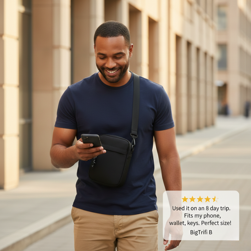 • Will my phone actually fit in this bag? Yes — the main compartment comfortably holds phones up to iPhone 17 Pro size, with room alongside for a power bank or sunglasses. Customers regularly fit their phone plus 5-6 other daily essentials.