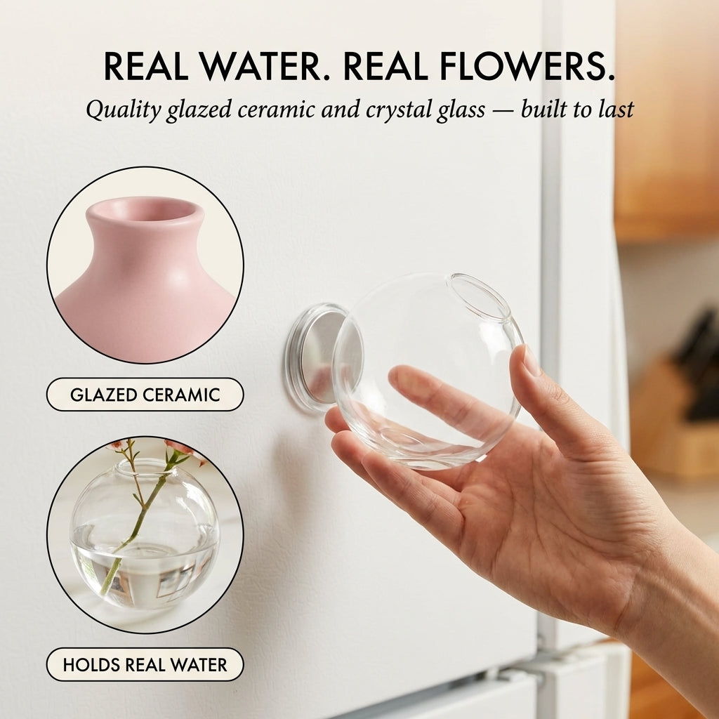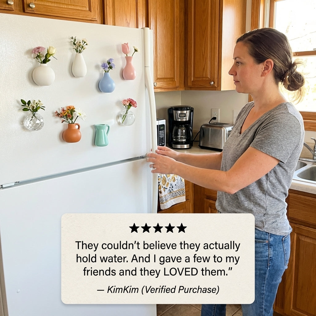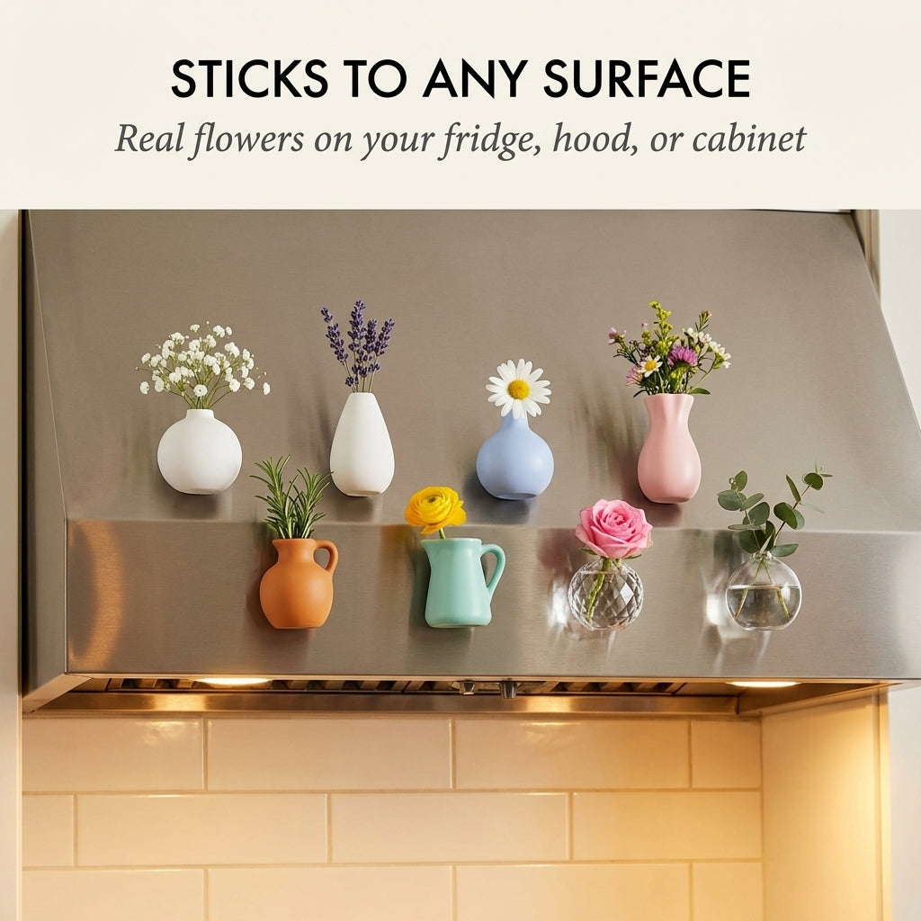 ✔ REAL FLOWERS STAY ALIVE ON YOUR FRIDGE — NOT JUST FAKE ONES Each tiny vase has a real water well built in — so you can pop in a real cutting from your garden, a flower from the farmer's market, or even just a sprig from your yard. Most customers are surprised: "Couldn't believe they actually hold water." The magnet base locks the vase firmly in place so nothing tips or spills.