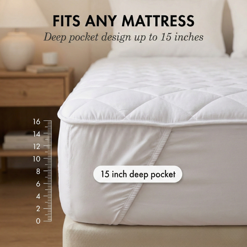 Material: Soft brushed microfiber quilted top with waterproof TPU backing — hypoallergenic, resistant to dust mites, mold, and mildew