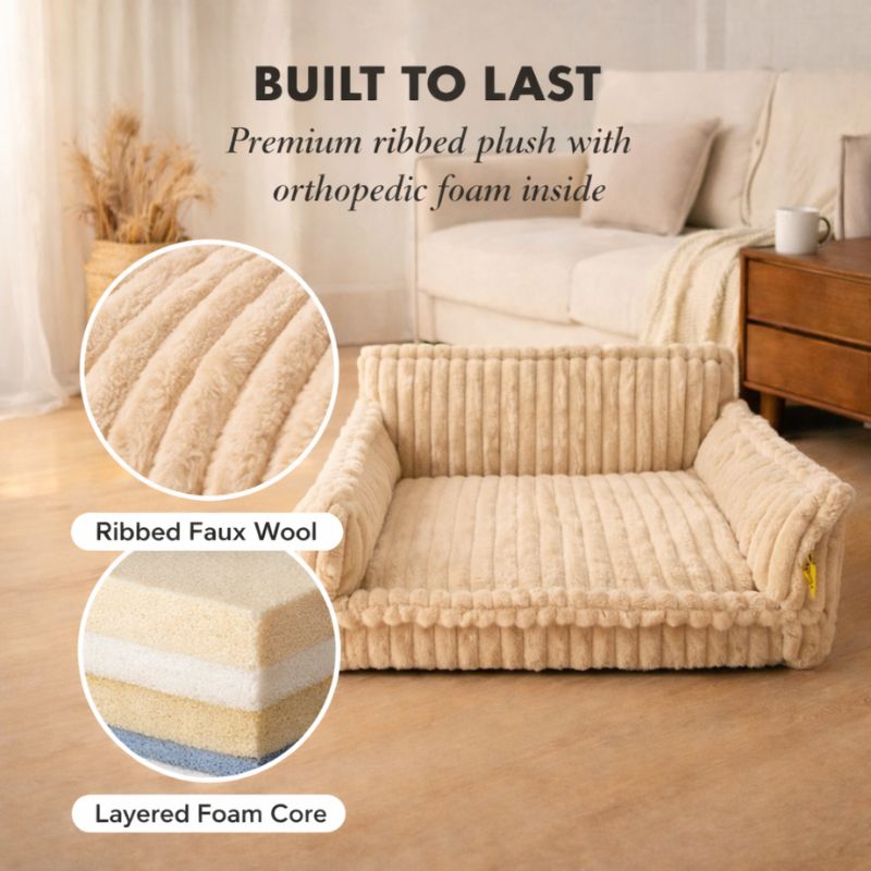 Materials: Ribbed faux-wool plush outer cover; layered orthopedic foam interior
