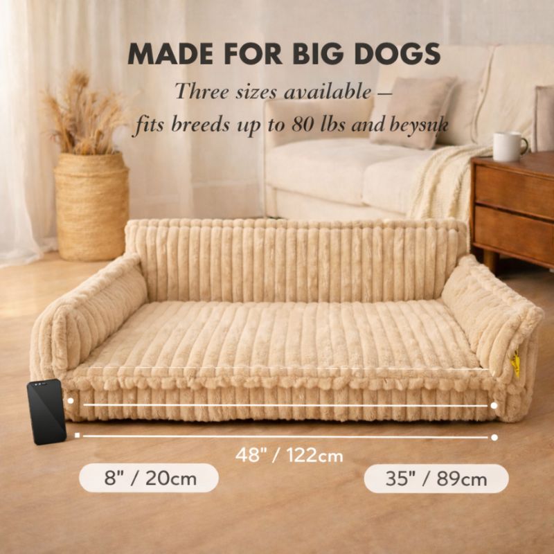What size should I pick for my large-breed dog? For dogs 50–80+ lbs, we recommend the 48"L × 35"W size. It gives big breeds full room to stretch and roll over without hanging off the edges. When in doubt, go one size up — dogs love extra room.