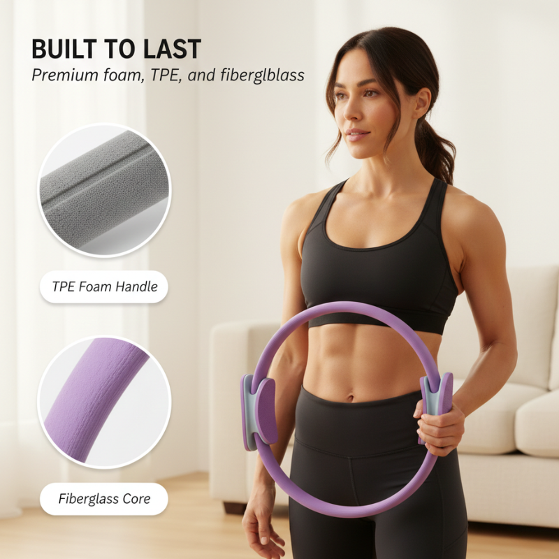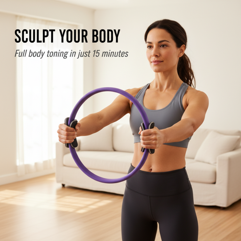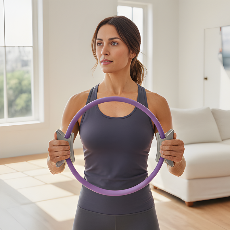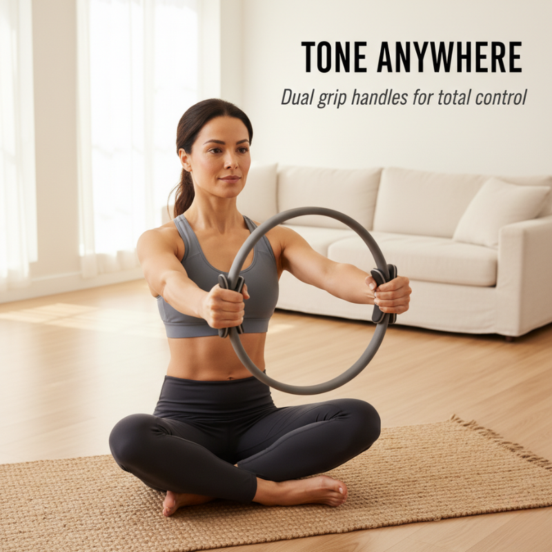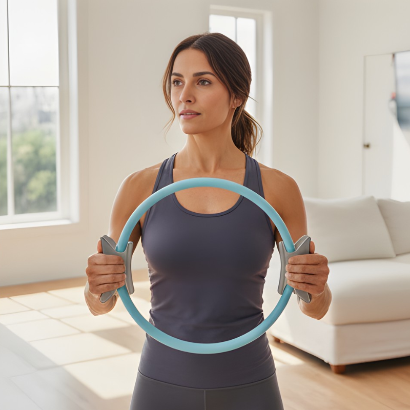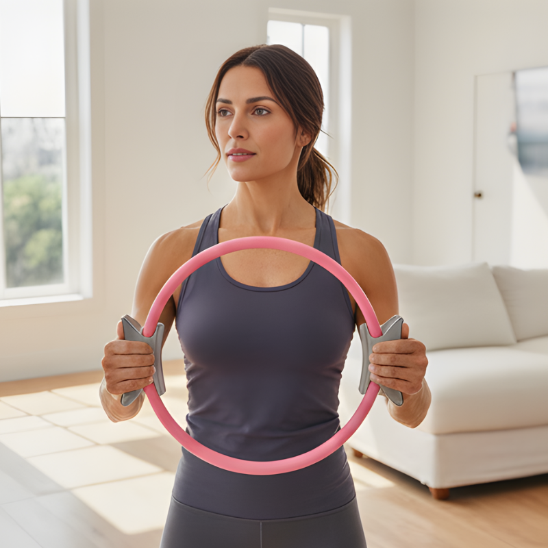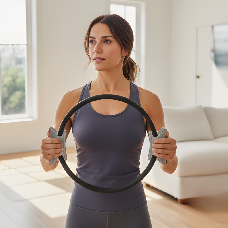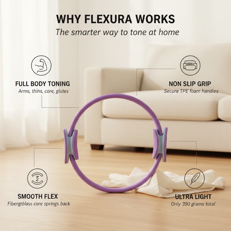 This is not another plastic gadget. This is the only tool you need for a complete Pilates toning session — 15 minutes a day, right on your living room floor. The gentle-but-firm resistance of the Flexura™ ring activates muscles that free weights and bodyweight exercises miss entirely — and you feel the difference from your very first squeeze.