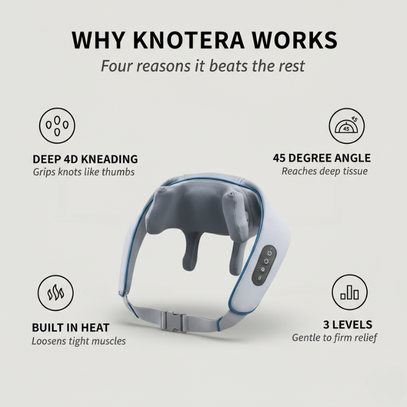 • Is this strong enough for deep knots, or is it just a gentle vibration? The Knotera™ uses 4D deep-tissue kneading — not vibration. The rotating nodes physically grip and knead your muscles at a 45° angle, with three intensity levels so you can go gentle for relaxation or firm for stubborn knots. Customers with chronic tension regularly report feeling relief within minutes of the first use.