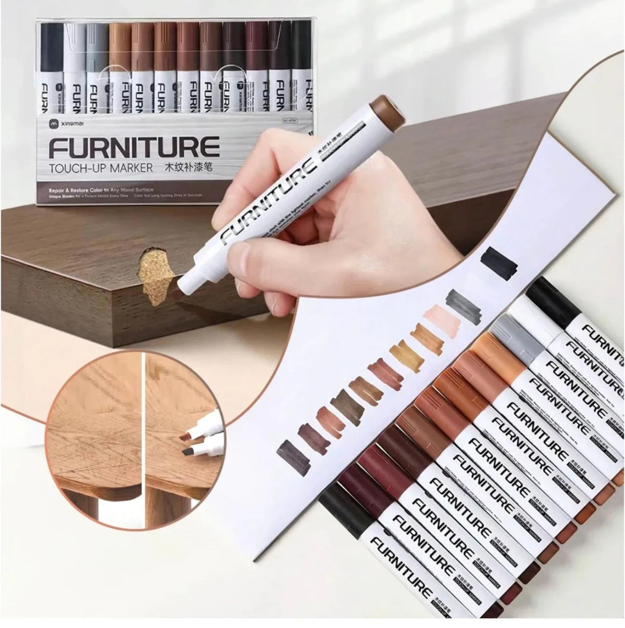 The mechanism is a professional FURNITURE TOUCH-UP MARKER set designed for a perfect color match on any wood surface.