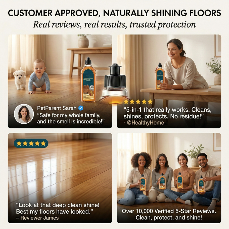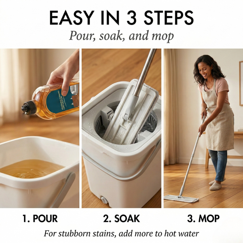 Just pour, soak, and mop — and watch years of dullness lift away to reveal the deep, warm shine hiding underneath your floors right now.